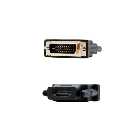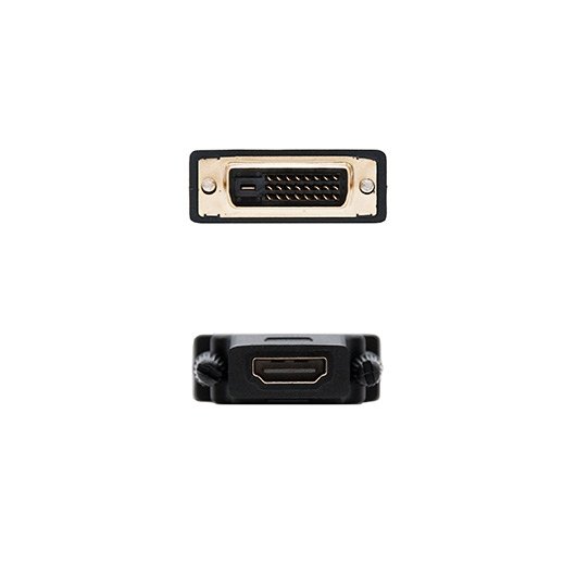Adaptador DVI a VGA con conector DVI tipo 24+5 macho en un extremo y VGA HDB15 hembra en el otro.