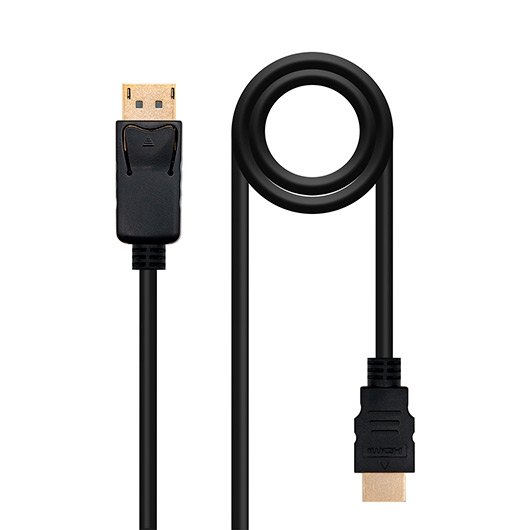 Cable conversor DP macho en un extremo y HDMI macho en el otro con conectores blindados en oro, soporte para resolución de hasta 4K y retrocompatibilidad con versiones de HDMI y DisplayPort anteriores.