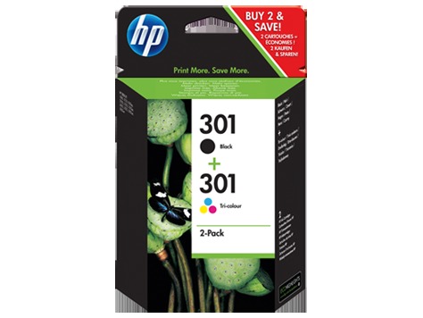 Los cartuchos del paquete combinado de cartuchos de tinta tricolor y negra HP 301 están diseñados para ofrecer unas funciones intuitivas a un precio muy asequible. Consiga toda la tinta negra y tricolor que necesita para imprimir texto negro de calidad láser y color intenso.Imprima texto de calidad láser, documentos, informes y cartas de intensos colores que resisten décadas, sin decolorarse[1]. Obtenga una calidad de imagen mejorada mediante los papeles con el símbolo ColorLok. HP le ayuda a reducir el impacto ambiental con el reciclado gratuito y fácil de cartuchos y con los cartuchos fabricados con contenidos reciclados[3]. Utilice los prácticos mensajes de aviso para identificar y comprar fácilmente cartuchos HP originales mediante HP SureSupply.[2] Los prácticos paquetes combinados de HP contienen un cartucho de tinta HP negra y uno tricolor y cuestan menos que dos cartuchos individuales comprados por separado. Los cartuchos de tinta negros y tricolores HP 301 ofrecen un rendimiento medio de 190 y 165 páginas respectivamente.