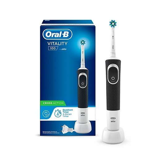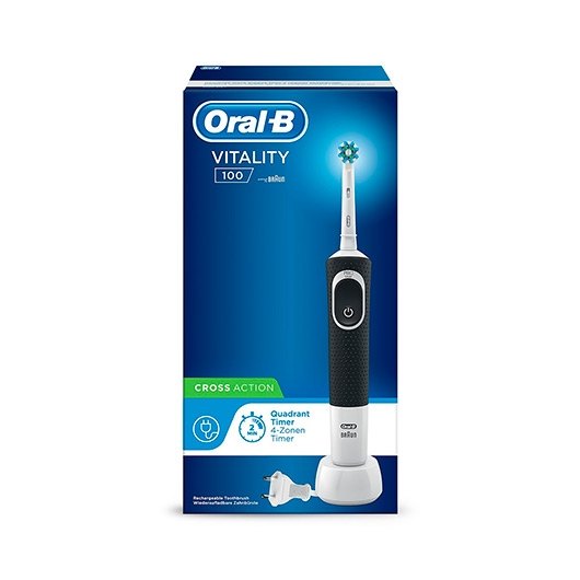 El cepillo de dientes eléctrico recargable Oral-B Vitality ofrece una limpieza clínicamente probada más intensa, en comparación con un cepillo de dientes manual normal. El cabezal de recambio CrossAction rodea cada diente con sus filamentos inclinados a 16 grados, mientras que la acción de limpieza 2D oscila y rota para eliminar más placa que un cepillo de dientes manual normal. Incluye un práctico temporizador en el mango que te ayuda a cepillarse los dientes durante los dos minutos que recomiendan los dentistas. Y lo mejor de todo es que es de Oral-B, la marca más usada por dentistas en todo el mundo. Compatible con los siguientes cabezales de recambio: CrossAction, 3D White, Sensi Ultrathin, Sensitive Clean, Precision Clean, FlossAction, TriZone, Dual Clean, Power Tip y Ortho Care.