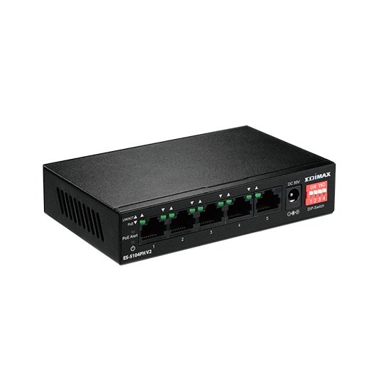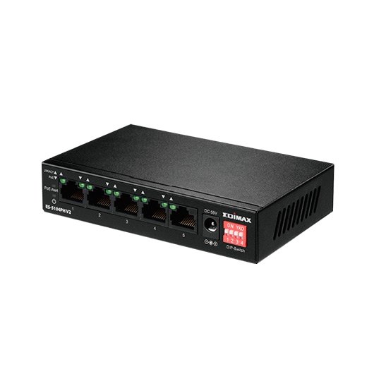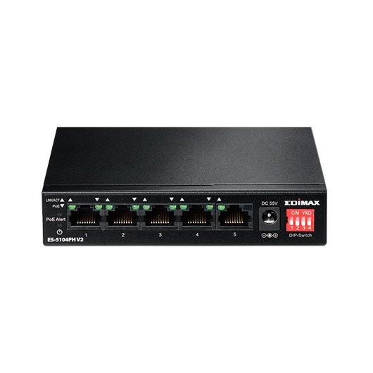 El Edimax ES-5104PH V2 es un conmutador Fast Ethernet de cinco puertos con cuatro puertos PoE+ diseñados para su uso en entornos de red domésticos, de redes pequeñas o medianas. Con cuatro interruptores DIP, los puertos PoE se pueden configurar manualmente con control de encendido / apagado, extendiendo la distancia de entrega de PoE hasta 200 metros y también se admite el control de encendido / apagado basado en puerto para VLAN y QoS. El conmutador se conecta fácilmente y suministra energía a dispositivos habilitados para PoE, como puntos de acceso inalámbricos, cámaras de red y teléfonos IP, así como a otros dispositivos habilitados para Ethernet, como ordenadores, impresoras o almacenamiento conectado a la red (NAS). El tamaño compacto y el diseño sin ventilador hacen que el switch sea una solución ideal para expandir las redes domésticas y de pequeñas empresas.