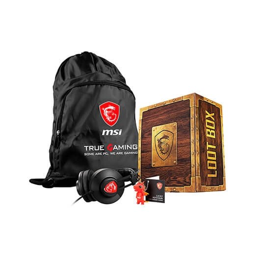 Pack Loot Box de MSI que incluye: Auriculares Gaming de color negro con almohadillas acolchadas y logo de MSI en los laterales Diadema ajustable que se adapta a distintos tamaños. Mochila de color negro y el logo de MSI con amplios compartimentos para guardar todo tipo de objetos. Un llavero rojo de la mascota oficial de MSI Lucky. Caja decorada con el logo de MSI y detalles imitando a la madera.
