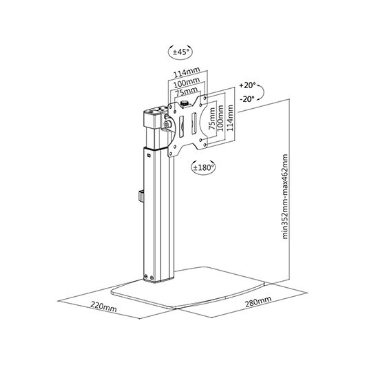Soporte para pantallas de entre 17” y 32”. Compatible con VESA 75×75 y 100×100. Un peso máximo soportado de 7Kg. Un ángulo de inclinación +20°/-20°. Un ángulo de giro de +45°/-45° y un ángulo de rotación de +180°/-180°.