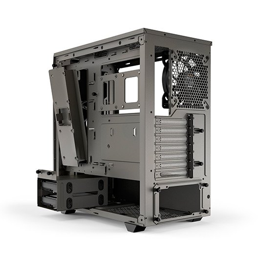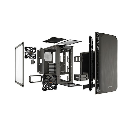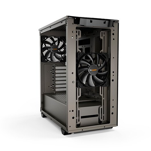 La cubierta superior regular completa perfectamente el diseño de la Pure Base 500. Una estera de aislamiento unida debajo garantiza un funcionamiento silencioso. Es la elección perfecta para sistemas refrigerados por aire y configuraciones de PC regulares y silenciosas. Los imanes fuertes aseguran que las cubiertas superiores se ajusten firmemente. Para todos los que se esfuerzan por obtener el máximo rendimiento y especialmente con los sistemas refrigerados por agua, la cubierta superior extremadamente permeable al aire es la opción correcta. Está hecha de telas de malla ligera, lo que garantiza el mayor flujo de aire posible. Dos ventiladores Pure Wings 2 preinstalados con aspas optimizadas aseguran un flujo de aire y enfriamiento perfectos. A pesar del diseño compacto de la carcasa, los ventiladores delanteros y traseros son modelos de 140 mm, lo que resulta en un funcionamiento muy silencioso. Además, se pueden instalar hasta tres ventiladores de 140 mm. Pure Base 500 ofrece dimensiones generosas para instalar tarjetas gráficas de alta gama y grandes disipadores de hasta 190 mm de altura. Los ventiladores o un radiador de hasta 360 mm se pueden instalar fácilmente en la parte delantera y el área superior también proporciona espacio para más ventiladores o un radiador de hasta 240 mm. La cubierta de la fuente de alimentación cubre perfectamente los cables y la fuente de alimentación. También contiene una caja doble HDD con montajes desacoplados que reducen las vibraciones y ayudan a maximizar el silencio. La jaula también se puede reposicionar para instalar un radiador de hasta 360 mm en la parte delantera. La unidad de fuente de alimentación se puede instalar fácilmente desde atrás, montada en el soporte de la fuente de alimentación provisto.