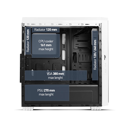 Hummer ZS Zero es el chasis más compacto de la renovada serie Hummer. Una semitorre disponible en blanco y negro con una gran ventana acrílica que permite ver el interior del equipo y todos sus componentes. En su interior es posible albergar un equipo de altas prestaciones con un excelente sistema de refrigeración que permitirá funcionar al equipo de manera óptima. – Compartimento aislado para la fuente de alimentación y HDD – Ventana lateral transparente – Dos controladores de velocidad para hasta 4 ventiladores con tres posiciones (LOW STOP HIGH) – Gran opción para sistemas de refrigeración líquida – Incluye 2 ventiladores de 120 mm – Lector de tarjetas compatible con SD micro SD – Conexión USB 3.0 de alta velocidad – Detalle de metal mesh en el frontal – Filtro antipolvo magnético – Excelente sistema para ordenar los cables – Espacio para instalar hasta 7 ventiladores – Compatible con gráficas de hasta 380 mm Accesos y panel frontal El panel frontal de Hummer ZS Zero cuenta con dos puertos USB 2.0 y dos puertos USB 3.0, así como las conexiones de audio. En el panel lateral encontramos, por un lado, dos controladores de velocidad para controlar hasta 4 ventiladores, regulables en 3 posiciones: LOW STOP HIGH, y por otro lado, lector de tarjetas SD y Micro SD, lo cual facilita la accesibilidad a las conexiones de todos nuestros dispositivos externos. Gestión de cableado y flujo de aire Gracias al gran lateral para la gestión del cableado, es posible realizar un montaje limpio y ordenado tras la placa base, para que nada influya en la circulación del aire. Pese a ser la pequeña de la serie, Hummer ZS Zero cuenta con espacio para albergar un equipo de altas prestaciones, ya que en su interior es posible instalar una gráfica de gran longitud, hasta 380 mm y coolers de una altura máxima de 161 mm. Capacidad de almacenamiento En cuanto a las opciones de almacenamiento, Hummer ZS Zero dispone de espacio para instalar hasta 6 unidades, ya que cuenta con dos bahías externas de 5.25 y capacidad para cuatro unidades más en su interior, dos de 3.5 en la parte inferior y dos SSD de 2.5 en el lateral. Este detalle, permite aprovechar mejor el espacio del interior, realizando un montaje más limpio que contribuya a mejorar el flujo de aire. Diseño La pequeña de la serie Hummer continúa con el diseño característico de toda la serie, frontales sobrios y elegantes acabados. El frontal ha sido diseñado con efecto brush y detalles de metal mesh en los laterales. La ventana acrílica que incorpora en el lateral permitirá tener una perfecta visión del interior del equipo y de todos sus componentes. Sistema de ventilación Hummer ZS Zero cuenta con un excelente sistema de ventilación, que garantiza un eficaz flujo de aire en el interior del equipo. En su interior cuenta con dos ventiladores de 120 mm preinstalados, uno en la parte frontal y uno en la parte posterior. Adicionalmente, ofrece la posibilidad de instalar tres ventiladores más de 120 mm dos en el frontal y uno en la parte superior. Cuenta con un compartimento en la parte inferior para ubicar la PSU y los HDD , de manera que el calor desprendido por estos, no se transfiera al resto de componentes. Además, este compartimento cuenta con la posibilidad de instalar dos ventiladores de 120 mm en su parte superior para extraer el calor generado por la PSU y los HDD. En su panel superior cuenta con un filtro anti polvo imantado, que además de ayudarnos a mantener el equipo limpio, ayudará a expulsar el calor del interior hacia fuera para mantener un excelente flujo de aire. Opciones de refrigeración Para que todos los componentes del interior de nuestro equipo puedan funcionar al máximo rendimiento, es preciso mantener una correcta refrigeración, por ello Hummer ZS Zero cuenta con la posibilidad de instalar en su interior sistemas de refrigeración líquida. Su frontal cuenta con espacio para sistemas de refrigeración con radiador doble de 240 mm y en el panel superior y trasero es posible albergar un radiador de 120 mm.