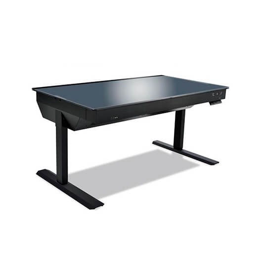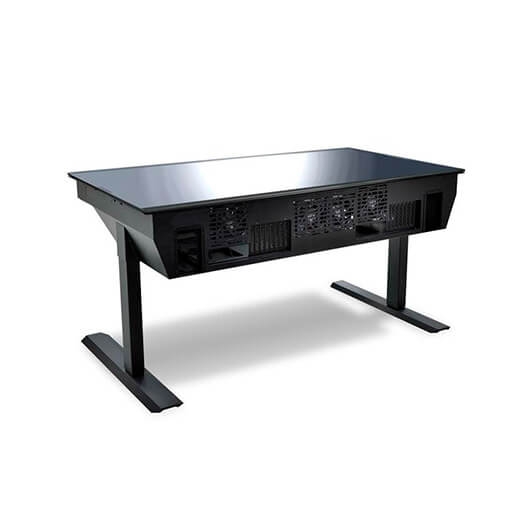 El controlador de altura ubicado al frente a la derecha de la mesa permite a los usuarios ajustar la altura del escritorio de acuerdo a sus necesidades. Más conveniente para el usuario, este diseño ergonómico permite a los usuarios cambiar las alturas siempre que necesiten para un trabajo cómodo. Exterior de aluminio premium combinado con un panel de vidrio templado grueso por el cual los usuarios pueden visualizar la agradable vista de la configuración de los sistemas. Con una presión sencilla del botón, los usuarios pueden decidir revelar el sistema completo teniendo cristal transparente, u ocultar el hardware y los componentes instalados en la parte interior al cambiar al modo opaco. DK-05F cuenta con muchas rejillas para albergar componentes de enfriamiento líquido masivos para que los sistemas funcionen al máximo rendimiento sin calentarse. Encima de los puertos de E/S, se encuentra un conjunto de botones del ventilador, iluminación y cristal templado para controlar hasta 5 velocidades de los ventiladores, 7 modos de color de las luces RGB y los 2 modos del vidrio templado. El kit de soporte de monitor permite a los usuarios instalar hasta 3 brazos de monitores en la parte posterior de la mesa para crear una vista amplia.
